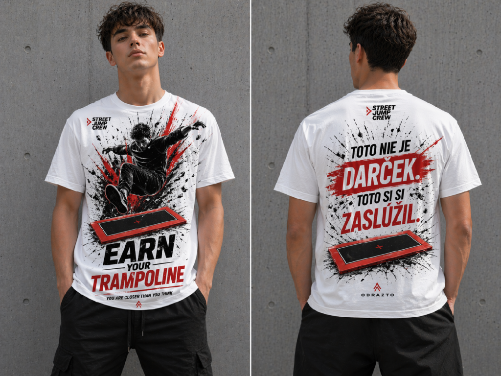 Tričko EARN YOUR TRAMPOLINE reprezentuje moment, keď prelomíš svoje limity a ideš naplno za cieľom. Výbuch energie, silný kontrast a dynamický výskok priamo nad trampolínou symbolizujú jediné: